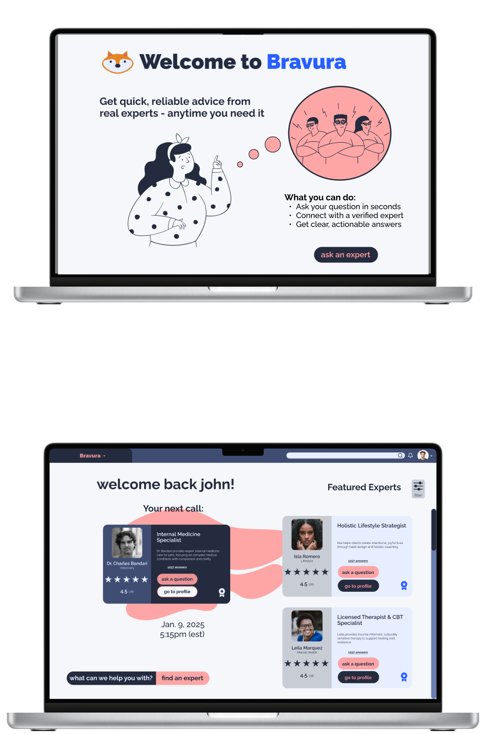 Developed as a capstone project during CareerFoundry’s UX Immersion, Bravura is a cross-platform solution designed to bridge the gap between curiosity and professional expertise. In an era of information overload, Bravura provides a direct line to verified specialists in health, finance, tech, and personal development, etc., empowering users to move from uncertainty to informed action with on-demand, reliable advice.