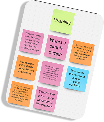 After collecting the responses to my interview questions, I used Miro to categorize each participant’s answers into a color coded affinity map. This helped me to visualize what was most important and to define the main themes and features of my app.