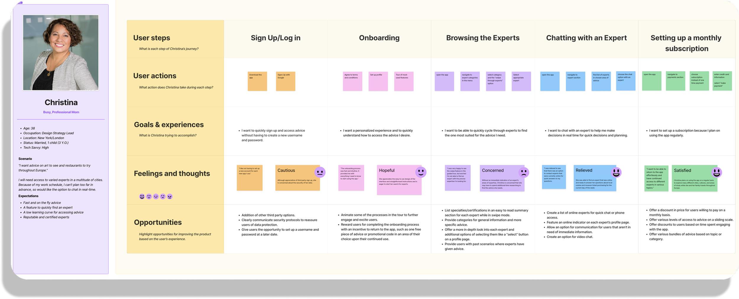 By interviewing real people and noting their concerns and desires, I was able to create user personas that represent a wide range of users, and our target audience. By addressing these insights, Bravura can offer features like a stream lined sign up and onboarding process, ways to categorize and select experts, and a way to view past interactions. Not only will users be able to communicate with professionals in a variety of formats (video, phone, messaging) they will have options for payment and level of commitment.