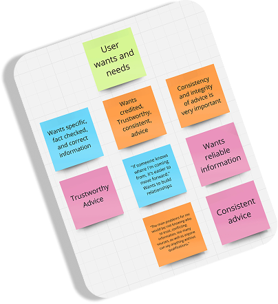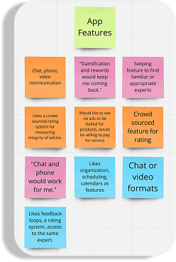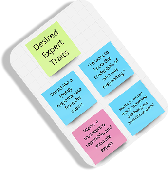 To better understand what real users would want from an advice app, I conducted initial rounds of user research in the form of in-person interviews. I began by defining clear research goals to understand how people go about receiving advice, more specifically from an online platform, and what they would want from an advice app. After my interviews, I used the answers to populate an affinity map to better understand and categorize the most essential user needs. What I found was that most users desires aligned with what Quora and JustAnswer lacked; mainly a transparent payment structure, vetted and certified experts, a wide range of topics, and trustworthy advice.