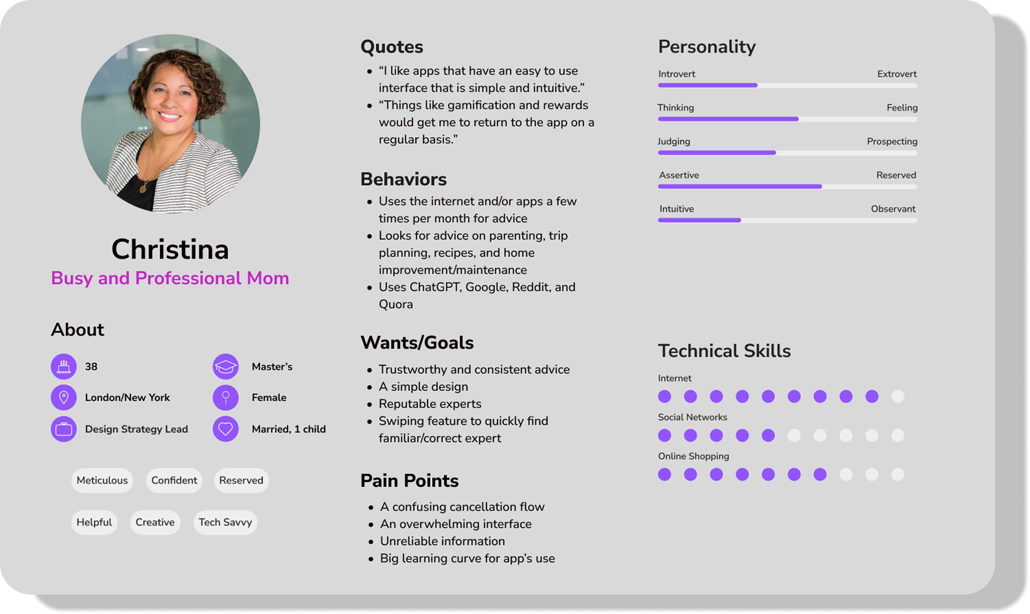 Christina is a married professional with a small child that balances her time at work and with her family, either at home or on vacation. Her powerful career splits her time between New York and London, so she is constantly on the go, and maintains two apartments.
